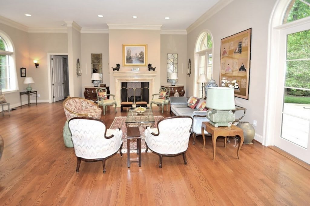 Built in 2014, this 14,500-square-foot brick home has 8 bedrooms, 12 bathrooms, 5 fireplaces, an elevator and a four-car garage. The grounds include an infinity-edge swimming pool, patios, landscaped areas and woods. The house has balconies, decks and an outdoor living room off the kitchen, family room and breakfast area. In addition to formal rooms, the mansion includes a library, a home theater, a wine cellar, a sauna and a separate apartment for guests.