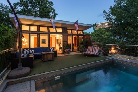 This Kalorama residence, located on a private alley between 21st and 22nd streets NW, is one of the city’s more usual homes. The four-story contemporary-style residence includes more than 2,000 square feet of outdoor space with a heated rooftop swimming pool and roof deck. The house has an 18-foot-tall entrance with a waterfall and a koi pond, an elevator, five bedrooms and five bathrooms. The 5,220-square-foot home also has three fireplaces and an open floor plan.