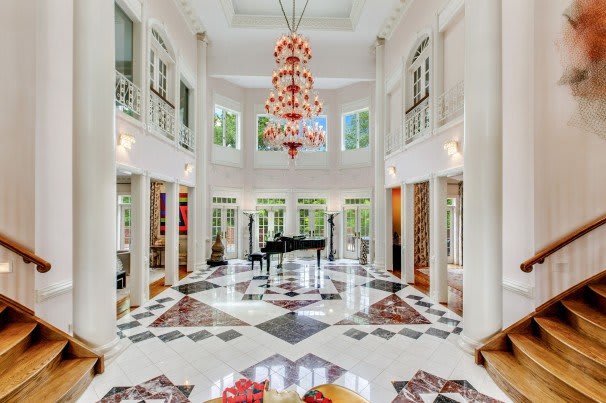 This estate, which rests on nearly three acres, has nearly 28,500 finished square feet on four levels with nine bedrooms and 19 bathrooms. The residence has an elevator, eight fireplaces, a two-story gallery and foyer for entertaining, formal and informal rooms and details such as marble flooring and custom-designed moldings. The home has an indoor swimming pool and the grounds include landscaped gardens and a sport court.