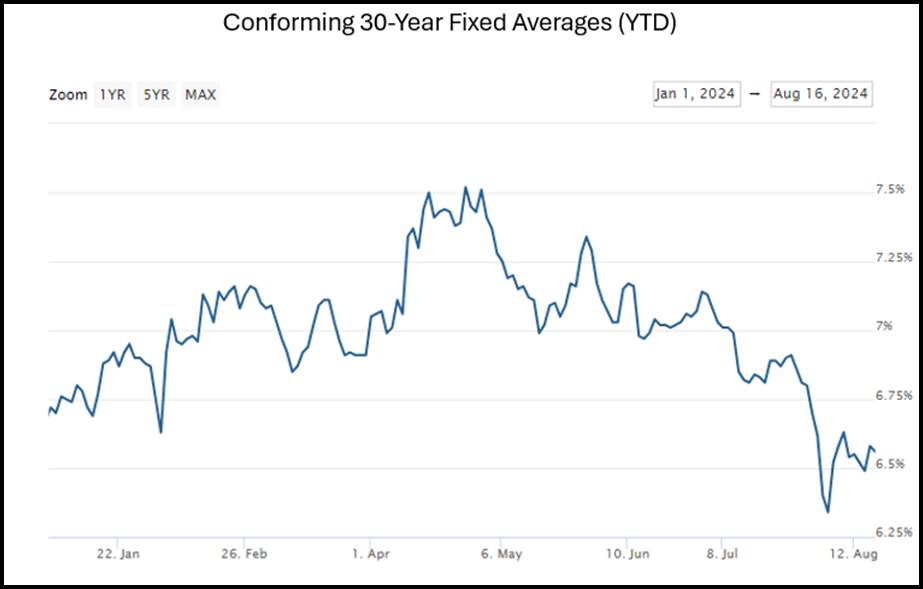 There's been widespread speculation as to the effect that falling rates will have on refinance demand in a world where 2/3rds of mortgages have fixed rates under 4%. This week's data suggests it's worth discussing; referencing the charts below reading from left to right. While the blue bars in the ‘Share of Loans by Fixed-Rate’ on the right side within the first chart may not be as big, they still represent 100s of millions of dollars of loan balances. In fact, there are nearly 10 billion dollars outstanding at rates of 7% and higher. As such, when last week's rates dropped briefly into the low 6% range (key factor- with paying at least 1% discount points), there was a mini glut of refi demand making BIG HEADLINES. The middle chart shows the latest refinance application index from the Mortgage Bankers Association (MBA) this past week. That may not look too "mini" at first glance, but context is important. In other words, we're barely back to what had been historically low levels of refi activity seen in late 2018 shown in the final chart ‘ Historical Refi Activity’. The counterpoint is that rates were only in the low 6's for an hour or two last Monday morning with very large ‘spreads’ as it relates to discount points, with mortgage investors demanding points which is typical in high-volatility times but offering far-improved rate levels relative to the scope (cost) of the points. As an example, a purchase or refinance applicant may have achieved 6.125% with paying 1% discount points but a zero-point option was closer to 6.875%-7.000% even with the big improvement. In this case, the ‘spread’ is the difference between a zero-discount point interest rate offering vs. the rate achieved by paying points. By the end of this week rate pricing normalized, where paying 1% discount point achieved a rate between 6.500% and 6.625% on average, where the zero-point option was still around 6.875%-7.000%. Bottom line: this is still proof of concept for more widespread refi demand in a scenario where rates move back into the 5s and hold those levels for more than a few hours in a stabilized market environment.