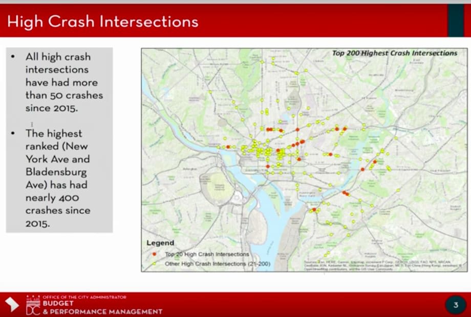 The Bowser administration shared a map of the intersections that have witnessed the most crashes since 2015. The highest-ranked—New York Avenue and Bladensburg Road NE—has had almost 400 crashes in that time. Marootian told lawmakers that the Minnesota Avenue and Benning Road NE and 14th and U streets NW intersections were also prone to crashes.