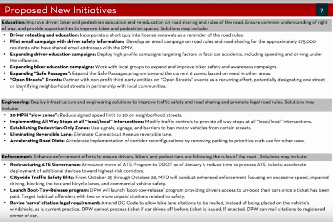 While voicing general support for Bowser’s refreshed Vision Zero push, several legislators suggested that success would be measured in data and changes in behavior. Prohibiting right turns during red lights at certain intersections “might be a good idea, but if you don’t have any enforcement on that, it’s not going to make any difference,” said David Grosso, an at-large councilmember. He called for more red-light cameras and dedicated lanes in the city.